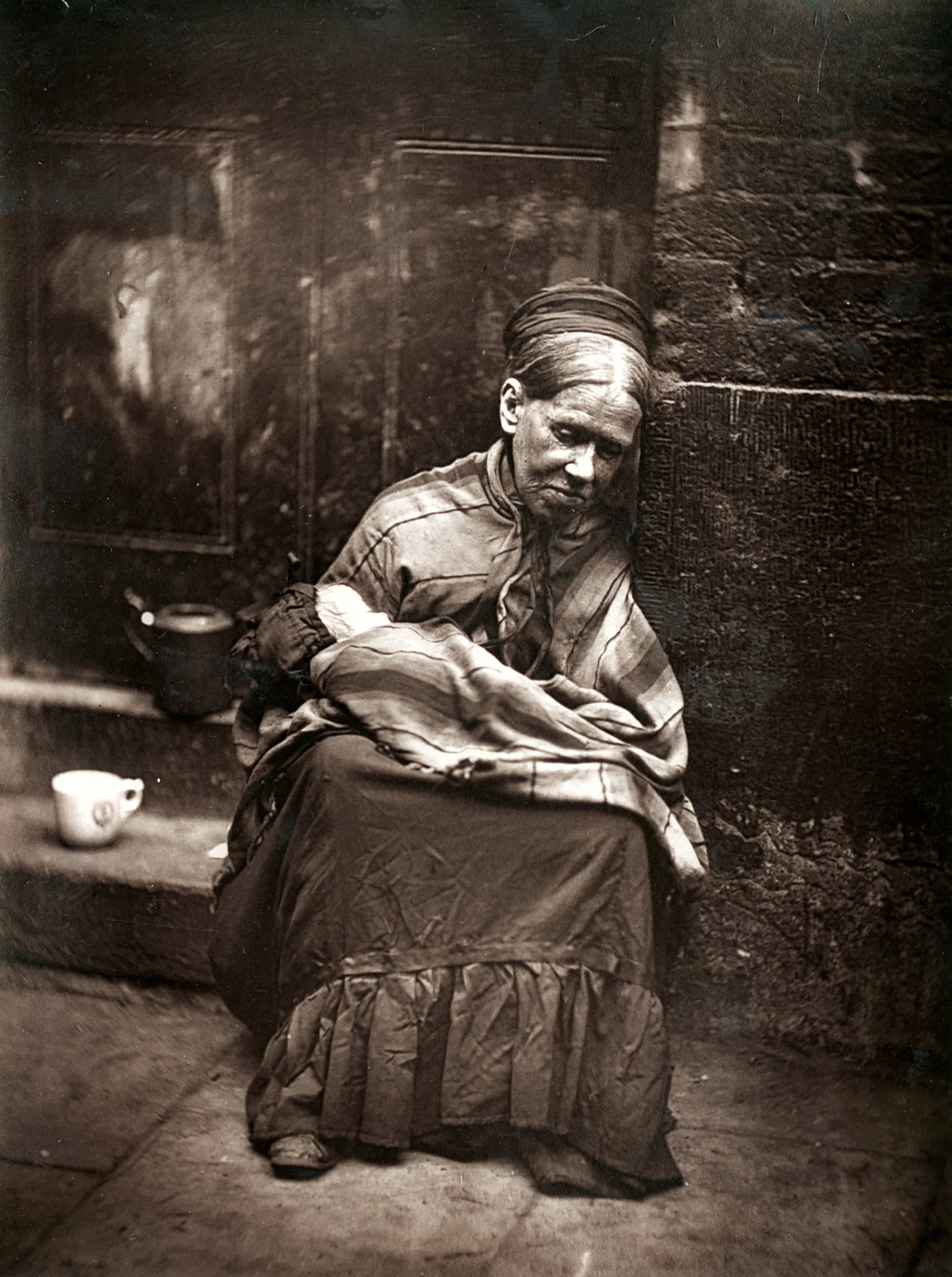 Homeless people have long been easy targets for photographers, and much of the imagery we associate with the Victorian era comes from images of people living in poverty. John Thomson and writer Adolphe Smith produced Street Life in London in 1877, which is considered the first example of social documentary photography. Thomson’s most famous image, The Crawlers, depicts a woman too impoverished to beg. According to Smith's caption, the woman was a widow of a tailor who had fallen into destitution after her son-in-law became unable to work, forcing her to leave her home. She looks after the baby of another woman who has found work, who later paid her in bread and tea.