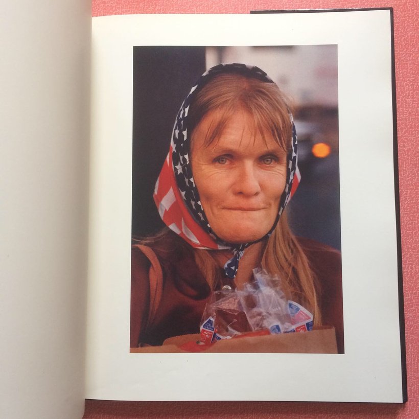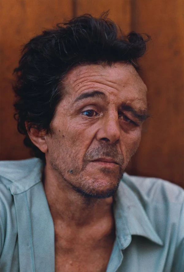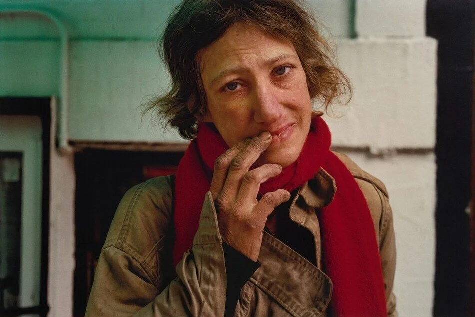 Bergman’s approach also feels different to someone like Boris Mikhailov, whose Case History (1997-1998) documents people in Kharkiv, Ukraine, whose homelessness was partly a consequence of the collapse of the Soviet Union. Although ethically complex, Mikhailov would pay his subjects for modelling for him, either with money, food or alcohol (depending on what people asked for). Both Mikhailov and Bergman have a tendency to draw upon Christian iconography when photographing their subjects. Mikhailov created pietà-like tableaux to frame marginalised people within the same visual categories typically reserved for “heroic” or “sacred” figures. Bergman’s figures, placed in front of highly saturated backgrounds, likewise resemble Christian icons. In the image below, I can’t help but see the sign behind the man as a sort of halo.