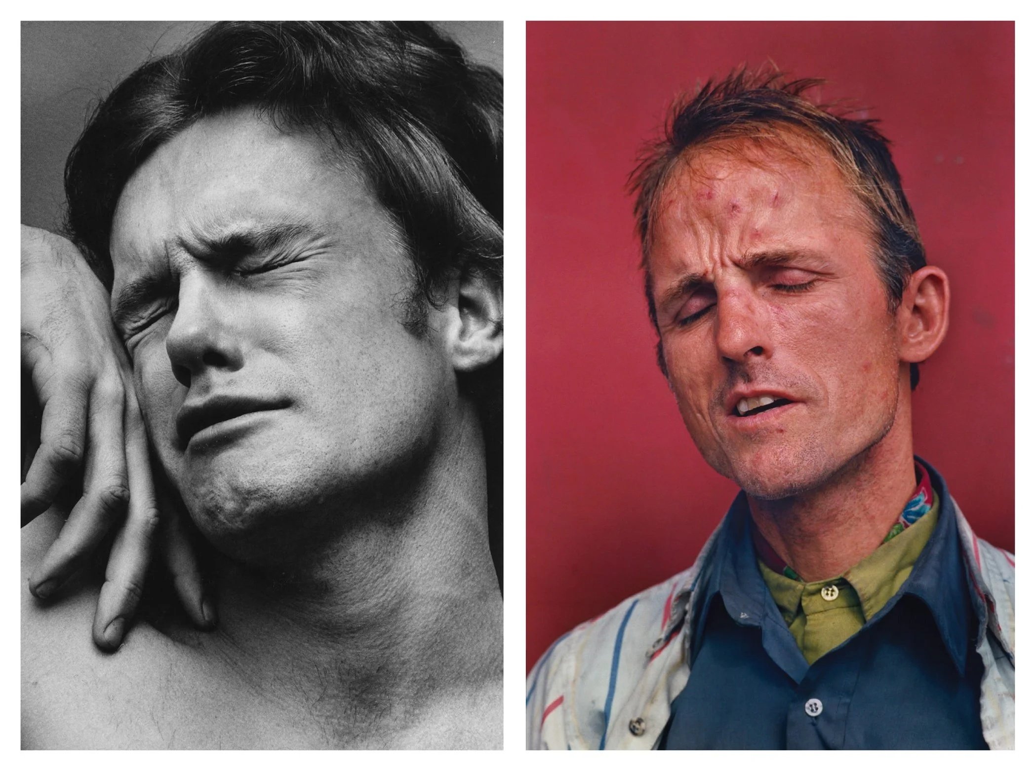 It’s tempting to compare one particular image of a man with his eyes closed to Orgasmic Man (1969) by Peter Hujar, the latter demonstrating the thin line between ecstasy, pleasure and pain. Is the man Bergman has photographed intoxicated, his frown the result of pleasure and a release from the here and now? Is he simply captured halfway through talking, or even singing, and have I projected the idea of intoxication onto him because of his closed eyes and dishevelled appearance? Or is the man overcome with emotion and on the edge of tears? For me, the image speaks hugely of transcience. He looks physically unwell and positioned on a threshold somewhere between life and death, meaning the in-between nature of his expression makes his overall demeanour all the more transitional and precarious.