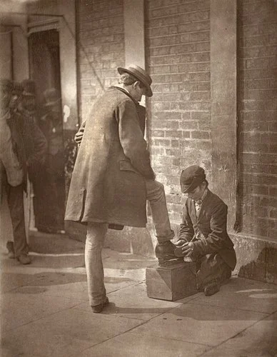 Thomson’s image below, titled The Independent Shoe Black (1877), is fascinating in that the child shoe-shiner becomes the subject of the photographic image for the first time. It is clearly posed, Thomson deliberately pointing the camera so that the face of the child is visible, the impoverished member of society granted a level of respect and even importance above the higher-class man who is presumably paying for his services.